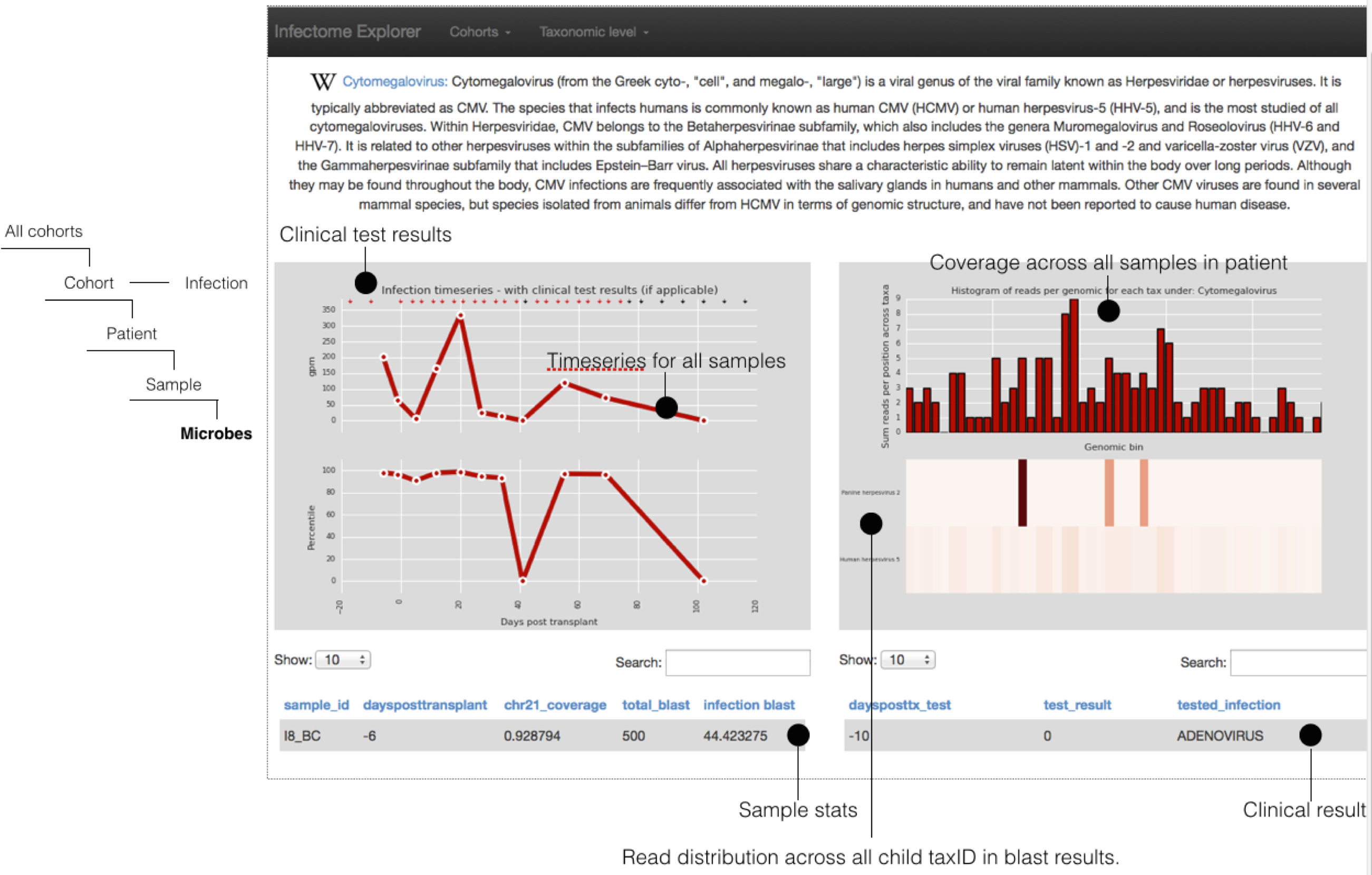 Data organization. After validating that the measurements could be clinically meaningful, we addressed the practical challenge of managing this large volume of data. To do this, we built an application that would serve the data such that clinicians and researchers could easily extract insights from it. We designed the application around the basic organization of the data, with natural segmentation of cohorts, patients, samples, and micro-organisms detected within each sample.