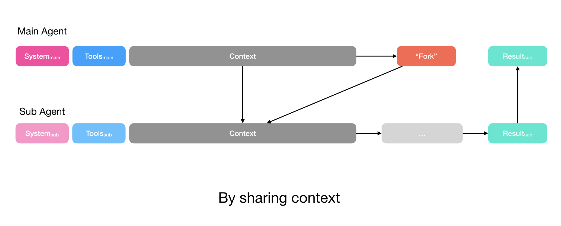 For more complex tasks (e.g., the sub-agent needs to write to files that the planner also uses), the planner shares its full context with the sub-agent. The sub-agent still has its own action space (tools) and instructions, but receives the full context that the planner also has access to.